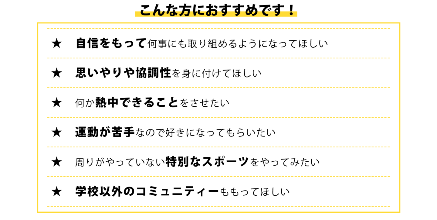 スポーツとパフォーマンスの2つの要素を兼ね備えている珍しいスポーツ。スポーツの一面は集中力、持久力、バランス力。パフォーマンスはリズム感、創造力を養います。そしてチームで一つの目標に向かって頑張ることによってチームワークが自然に身に付き協調性・自主性・コミュニケーション能力が育める素晴らしいスポーツです!