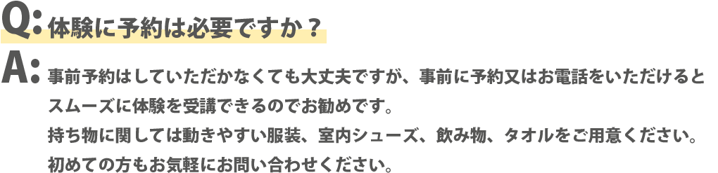 - 持ち物(動きやすい服装、室内シューズ、水分補給の飲み物、タオル)